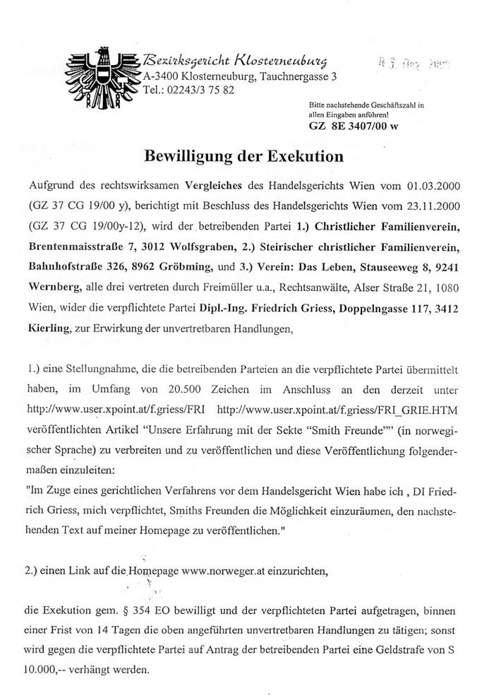 In dem Verfahren vom 1. März 2000 hatte sich Griess u.a. vor Gericht verpflichtet, eine objektive Stellungnahme der Norweger-Bewegung auf seiner Internetseite zu veröffentlichen. Dem kam er letztlich nicht nach und deshalb sah sich die Norweger-Bewegung gezwungen, Exekution zu führen.