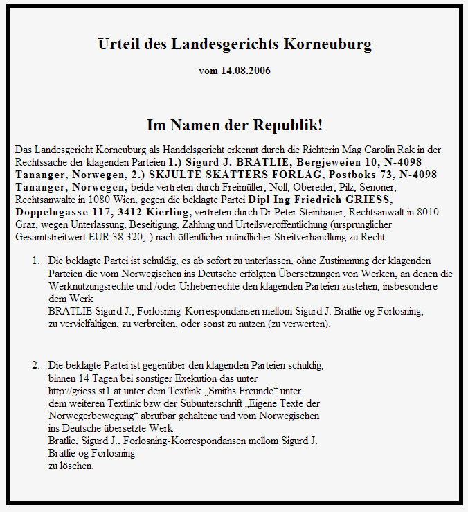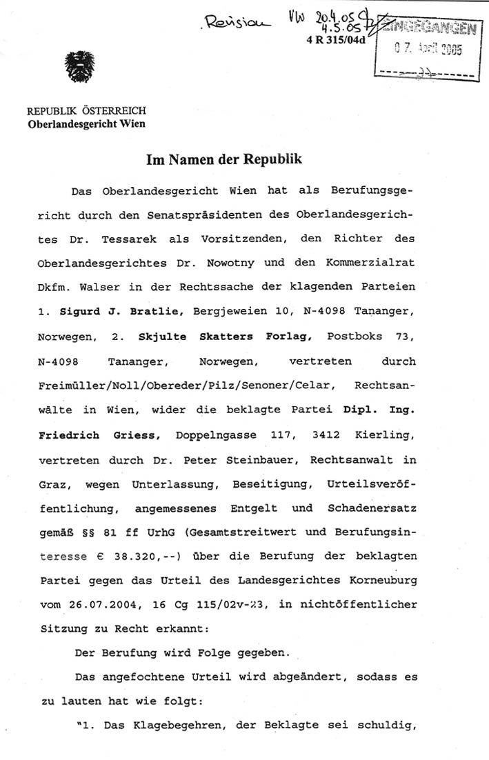 . Da er sich mehrmals über diese gerichtlichen Auflagen hinweggesetzt hat, sahen wir uns genötigt, Exekution zu führen (vgl. Exekutionsprozess Handelsgericht Wien, April 2004, in dem er zu einer Beugestrafe verurteilt wurde). Neben den ständigen Diffamierungen in Wort und Schrift, verbreitet Herr Griess über seine Internetseite ohne Zustimmung unseres Verlages Textfragmente, Zitate und Auszüge aus verschiedenen Werken und kommentiert sie in einer diffamierenden und unsachlichen Weise. Viele von diese Textstellen stammen aus alten Schriften, die Griess offensichtlich mit böser Absicht aus dem Zusammenhang reißt, um unsere Bewegung in ein autoritäres, gesellschafts- und frauenfeindliches Licht zu rücken.