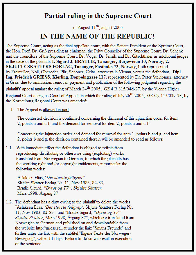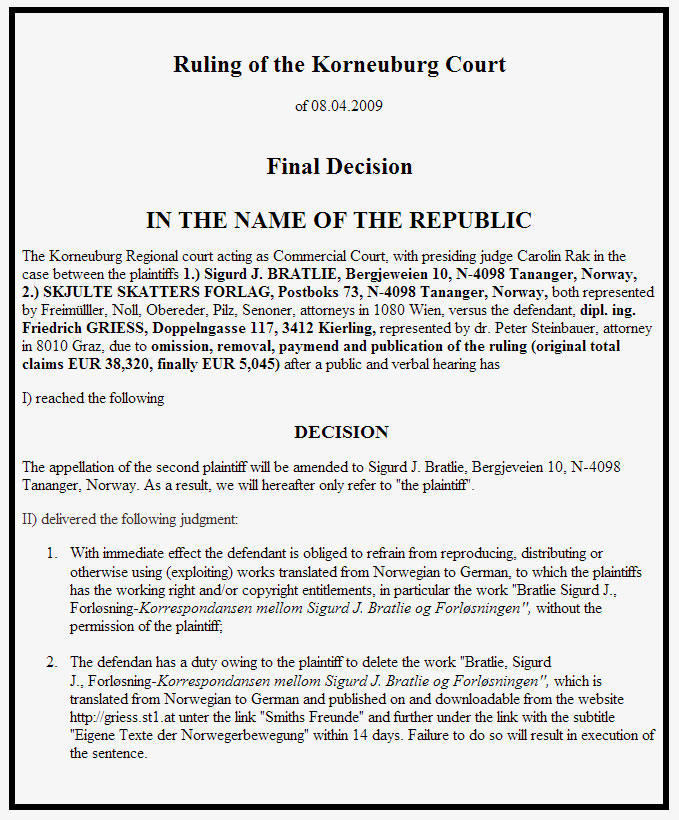 - The legally binding “FINAL RULING” of the Korneuburg Regional Court : Mr. Griess must remove the correspondence between Mr. Gjøsund and Sigurd Johan Bratlie from his website.